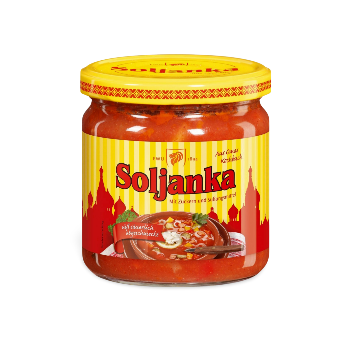 Tauchen Sie ein in die köstliche Welt der russischen Küche mit Soljanka – einer Suppenspezialität, die süß-säuerlich abgeschmeckt ist und den Gaumen verwöhnt. Gefüllt mit feinen Fleischwurststreifen, Kasslerbauch, sauren Gurken, Zwiebeln und Paprika, ist diese Suppe ein wahrer Genuss. Ein echter Klassiker aus Omas Kochbuch, der Tradition und Geschmack vereint. Hergestellt in Serba, Thüringen, steht unsere Soljanka für Qualität und Authentizität. Und das Beste daran? Ungeöffnet und ohne Kühlung lange haltbar – ideal für die Bevorratung. Holen Sie sich jetzt Ihre Vorräte und genießen Sie den unverwechselbaren Geschmack von Soljanka!