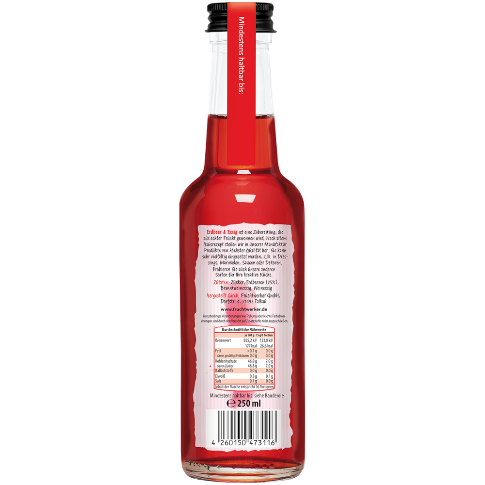 Tauche ein in die Welt der feinsten Aromen, denn für unser Produkt verwenden wir nur die vollreifsten, leuchtend roten Erdbeeren der Sorte “Senga Sengana” aus Schmilau, Schleswig-Holstein – sorgfältig ausgewählt von unserem vertrauenswürdigen Bauern. Diese köstlichen Früchte werden direkt nach der Ernte schockgefrostet, um ihre unvergleichliche Frische und Qualität das ganze Jahr über zu bewahren.Unser Manufaktur-Essig wird ausschließlich mit diesen aromatischen, handverlesenen Erdbeeren hergestellt, was ihm seinen einzigartigen und unwiderstehlichen Geschmack verleiht. Ob als Dressing für Salate, Verfeinerung von Saucen oder als Topping für Desserts – unser “Erdbeer & Essig” ist ein unverzichtbarer Genuss in der Küche.Erlebe selbst, warum unser Produkt so beliebt ist! Genieße den herrlich intensiven Geschmack, der deine Sinne verzaubern wird. Entdecke noch heute die kulinarische Meisterleistung, die in jeder Flasche unseres Erdbeer & Essig steckt.