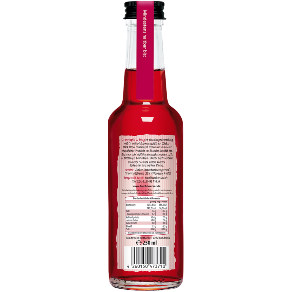 Tauche ein in die Welt der feinsten Aromen, denn für unser Produkt verwenden wir nur reife Granatäpfel von unserem Liefernaten aus der Türkei.Diese köstlichen exotischen Früchte werden direkt nach der Ernte verarbeitet, um ihre unvergleichliche Frische und Qualität zu erhalten. Unser Manufaktur-Essig wird ausschließlich mit diesen aromatischen, handverlesenen Granatapfelkernen hergestellt, was ihm seinen einzigartigen und unwiderstehlichen Geschmack verleiht. Ob als Dressing für Salate, Verfeinerung von Saucen oder als Topping für Desserts – unser “Granatapfel & Essig” ist ein unverzichtbarer Genuss in der Küche.Erlebe selbst, warum unser Produkt so beliebt ist! Genieße den herrlich intensiven Geschmack, der deine Sinne verzaubern wird. Entdecke noch heute die kulinarische Meisterleistung, die in jeder Flasche unseres Granatapfel & Essig steckt.
