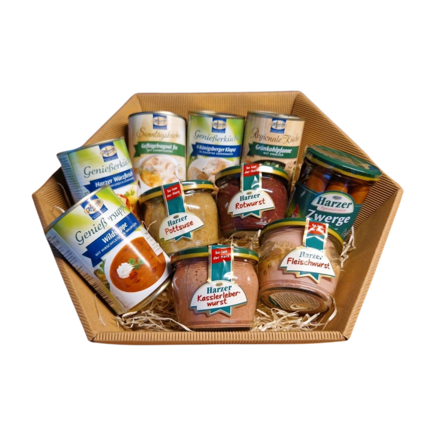 Der große Geschenkkorb “Der Harz groß” besteht aus je ein Mal:Harzer Würzfleisch 400gr, Wildsuppe mit Hirschfleisch 400ml, Geflügelragout fin 400gr, 4 Königsberger Klopse 400gr, Grünkohlpfanne 400ml, HARZER Pottsuse 200gr, HARZER Rotwurst 200gr, HARZER Kasslerleberwurst 200gr, HARZER Fleischwurst 200gr, HARZER Zwerge, Würstchen im zarten Saitling 375gr. Alles ist in einem Geschenkkorb aus Pappe mit natürlicher Holzwolle verpackt.